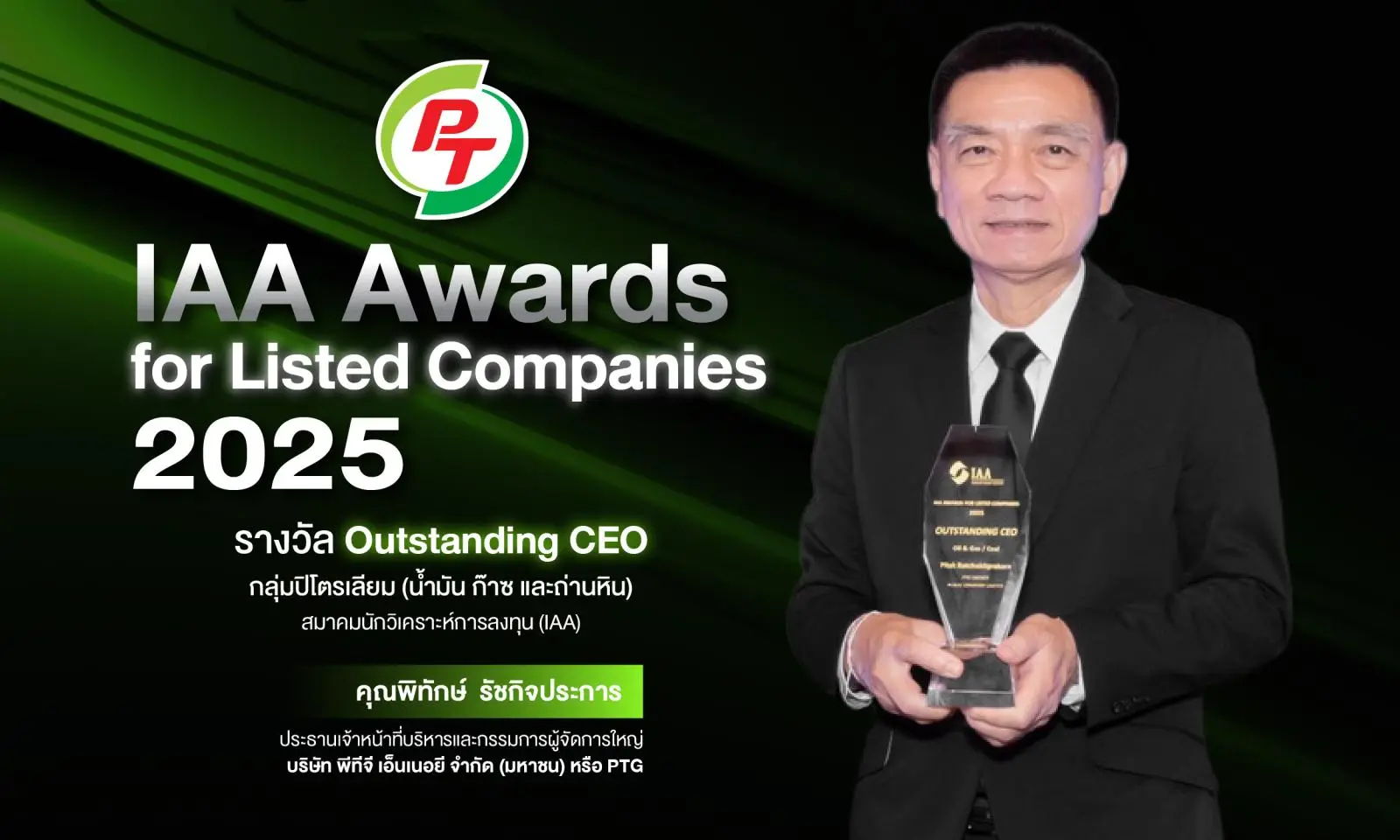 นายพิทักษ์ รัชกิจประการ ประธานเจ้าหน้าที่บริหารและกรรมการผู้จัดการใหญ่ บริษัท พีทีจี เอ็นเนอยี จำกัด (มหาชน) (PTG) เข้ารับรางวัล IAA Awards for Listed Companies 2025 สาขา “Outstanding CEO” ประเภทกลุ่มอุตสาหกรรมปิโตรเลียม (น้ำมันและก๊าซ) จากการเสนอชื่อและให้คะแนนของนักวิเคราะห์และผู้จัดการกองทุนของบริษัทหลักทรัพย์ ซึ่งจัดโดยสมาคมนักวิเคราะห์การลงทุน (IAA) เพื่อสะท้อนการบริหารงานดีเด่น รวมถึงจรรยาบรรณ และบรรษัทภิบาลในการดำเนินธุรกิจ ทั้งยังสามารถนำพาองค์กรให้เติบโตก้าวหน้าอย่างยั่งยืน