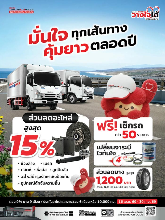 บริษัท ตรีเพชรอีซูซุเซลส์ จำกัด โดย คุณวิชัย สินอนันต์พัฒน์ รองกรรมการผู้จัดการ เชิญชวนเจ้าของรถอีซูซุเข้ารับบริการที่ศูนย์บริการมาตรฐานอีซูซุ พร้อมรับความคุ้มค่าในแคมเพจ์น“ได้ทั้งลด ได้ทั้งคะแนน”สำหรับรถปิกอัพและรถยนต์นั่งอเนกประสงค์อีซูซุทุกรุ่น และแคมเพจ์น“มั่นใจ ทุกเส้นทาง คุ้มยาว ตลอดปี”สำหรับรถบรรทุกอีซูซุขนาดใหญ่ (2 ตันขึ้นไปทุกรุ่น) ผ่านแอปพลิเคชัน my-ISUZU ครอบคลุมทั้งการประหยัด ดูแลรถครบ จบในที่เดียว เมื่อเข้ารับบริการที่ศูนย์บริการมาตรฐานอีซูซุทั่วประเทศ ตั้งแต่วันที่ 16 เมษายน 2569 ถึง 30 กันยายน 2569