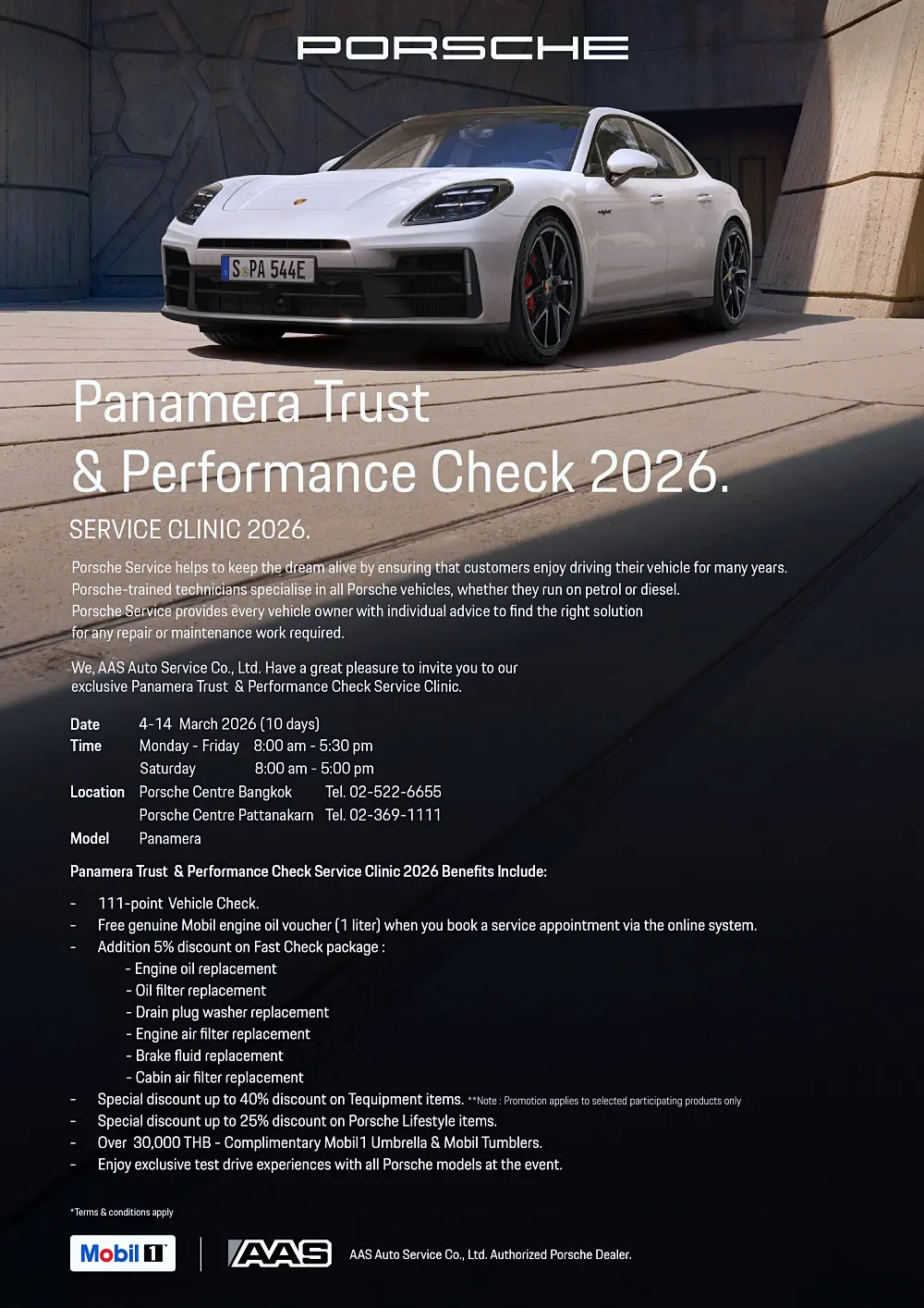 เอเอเอส ออโต้ เซอร์วิส จัดแคมเปญตรวจเช็ก Porsche Panamera 2026 ฟรี 111 จุด พร้อมส่วนลดอะไหล่สูงสุด 40% วันนี้-14 มี.ค. 69 ที่ศูนย์ปอร์เช่