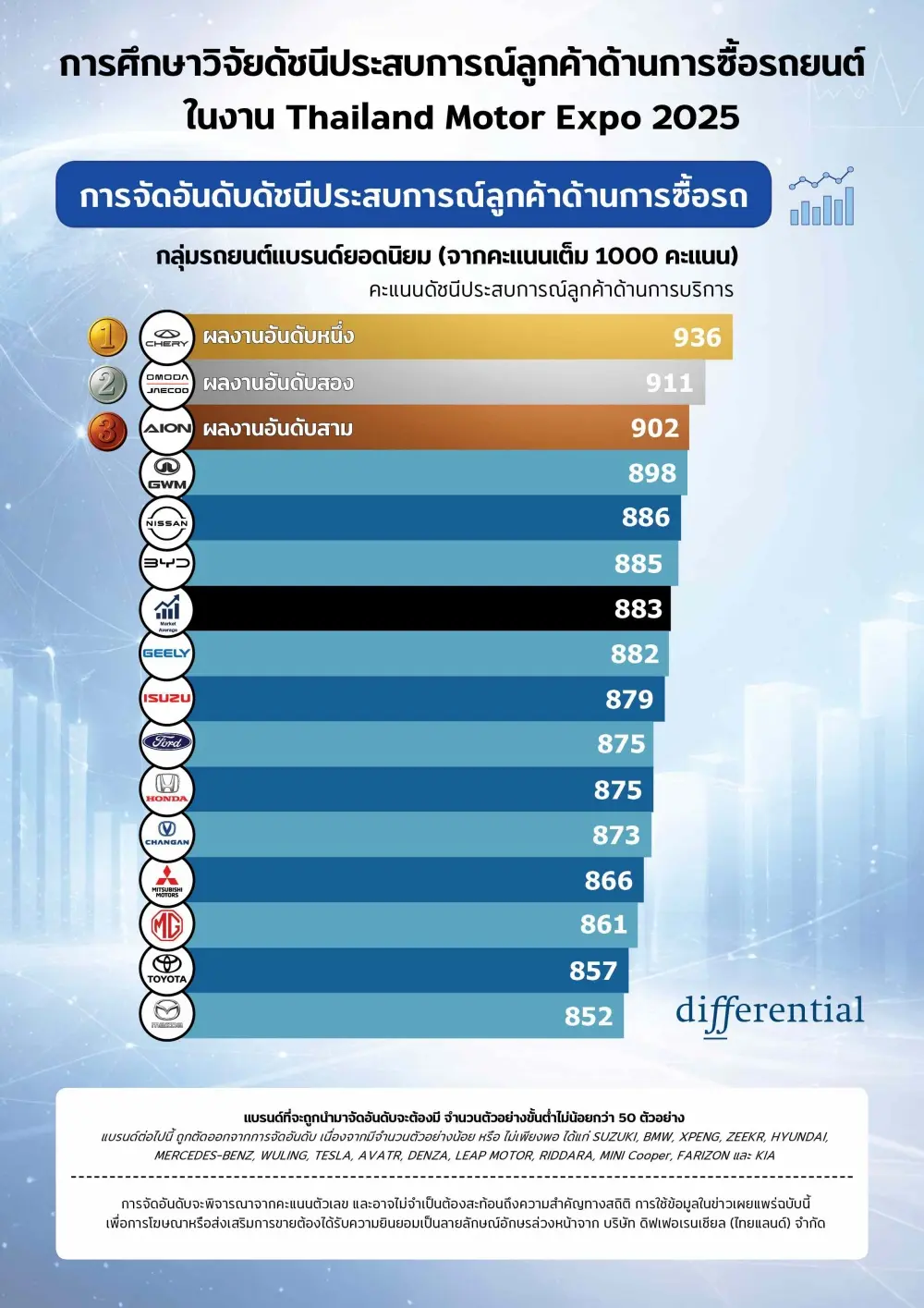 บรรยากาศหลังจบงานมหกรรมยานยนต์ หรือ Motor Expo 2025 ยังคงมีความเคลื่อนไหวที่น่าสนใจ ล่าสุดมีการเปิดเผยผลวิจัยจาก "ดิฟเฟอเรนเชียล (ไทยแลนด์)" ที่ชี้ให้เห็นว่าแบรนด์รถยนต์ที่ผู้บริโภคให้คะแนนความพึงพอใจสูงสุดในการซื้อรถ ได้แก่ 3 แบรนด์มาแรงอย่าง Chery , JAECOO และ AION