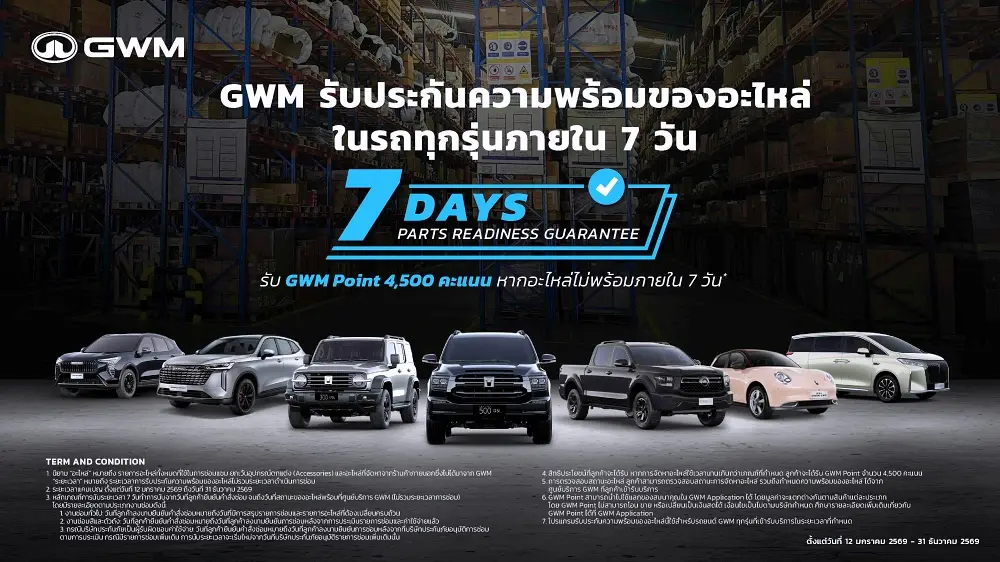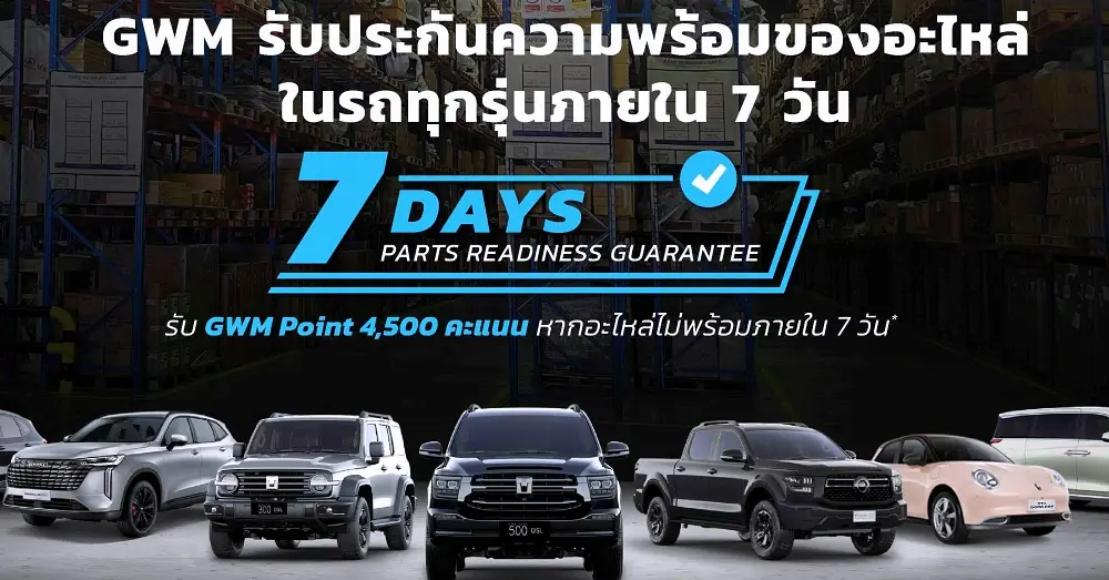 เงื่อนไขที่ผู้ใช้รถต้องรู้ แคมเปญนี้ไม่ได้แปลว่า "ซ่อมเสร็จใน 7 วัน" แต่หมายถึง "อะไหล่ต้องมาถึงศูนย์ฯ ภายใน 7 วัน" เพื่อให้ช่างเริ่มงานได้ โดยครอบคลุมรถยนต์ทุกรุ่นในค่าย ตั้งแต่ Haval Jolion, Tank 300 2026 ไปจนถึง Tank 500 2026 โดยมีกติกาชดเชยที่ชัดเจนคือ หากทำไม่ได้ GWM ยอมจ่ายค่าปรับให้ลูกค้าเป็น 4,500 คะแนน (GWM Points)